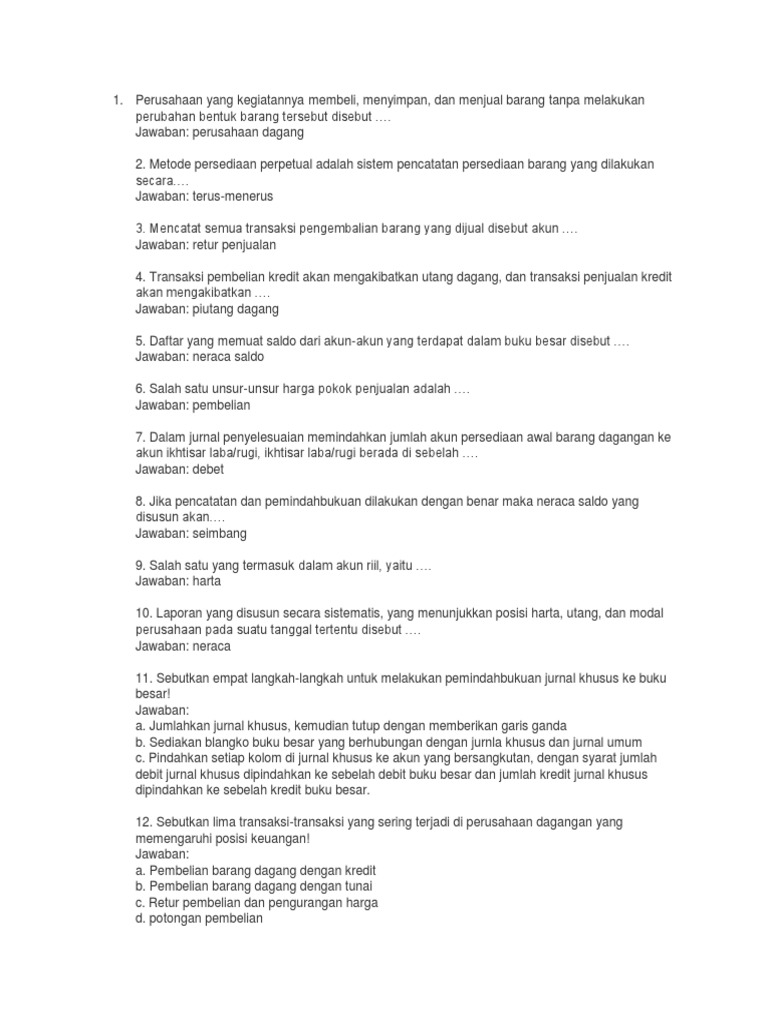 Diketahui data perusahaan dagang kusuma pada tahun 2005 sebagai berikut Itulah tadi kumpulan contoh soal cerpen pilihan ganda beserta jawabannya kelas 9. Berkaitan antara satu dengan lainnya c. Hal yang membedakan perusahaan dagang dengan perusahaan jasa adalah …. Soal uas ski kelas x xi xii semester 1 ganjil. ← download soal bahasa inggris un sma 2019 download soal bahasa inggris smp kurikulum 2013 →. Materi sebelumnya soal essay dan jawaban tentang sistem reproduksi pada manusia kelas 9. Rekapitulasi yang akan dikerjakan pada buku jurnal khusus dapat berfungsi sebagai. Latihan soal pilihan ganda tentang siklus akuntansi perusahaan dagang lengkap jawaban. Dilihat dari fungsinya, akuntansi diartikan sebagai… a. Pilihlah lah jawaban a, b, c, d atau e yang tepat sesuai dengan keadaan dalam text yang diberikan di bawah ini. Seorang pemain dengan sengaja memegang bola dalam pertandingan sepak bola, wasit memberikan penalti. Play soal penjas tentang bola volly pilihan ganda dengan kunci jawaban.docx.